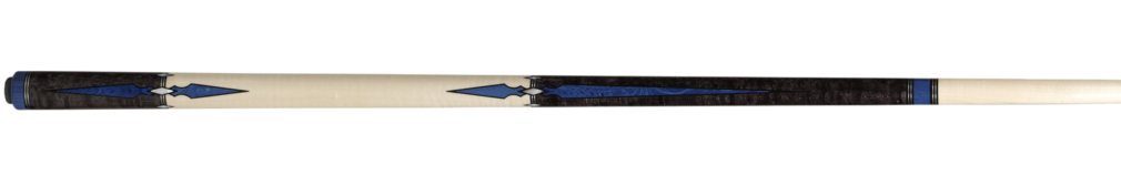 A Burgundy-stained Bird’s Eye cue with 5 sim Ebony framed Maple points. Sim Ebony framed Pearl inlays with an Irish Linen wrap section.
