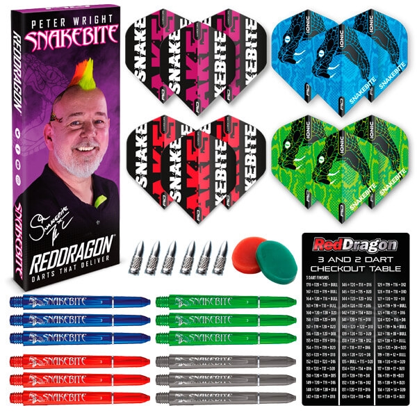 Peter Wright tilbehørskit fra Red Dragon indeholder følgende dele: - 4 sæt Peter Wright Flights - 4 sæt Skafter i Polykarbonat (forskellige farver i størrelsen medium) - 2 stk. fingervoks - 2 sæt flightbeskyttere - 1 slibesten - 1 lukketabel